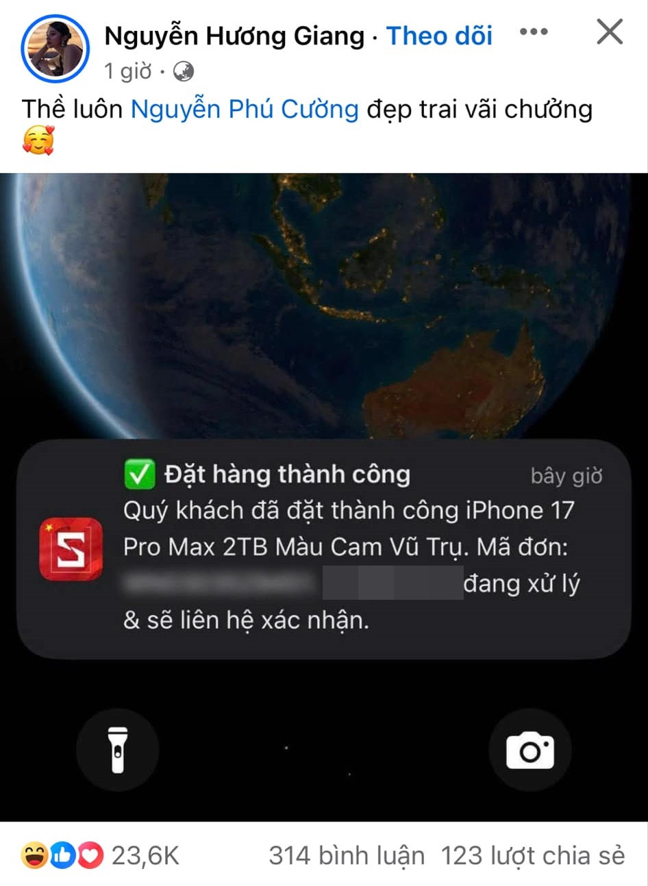 Vừa qua, Hương Giang cũng vui mừng thông báo khi được tình trẻ kém 3 tuổi cưng chiều, tặng luôn điện thoại iPhone 17 màu cam vũ trụ phiên bản 2TB đắt đỏ nhất có giá khoảng 64 triệu đồng.