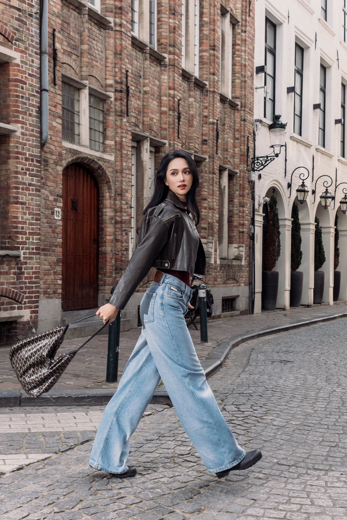 Trong hình, hoa hậu khoe trình phối đồ đẳng cấp với áo thun, quần jeans khoác ngoài áo da cá tính, năng động. Hương Giang nâng tầm diện mạo bằng chiếc túi hiệu sang chảnh từ nhà mốt Goyard Boheme Boho.