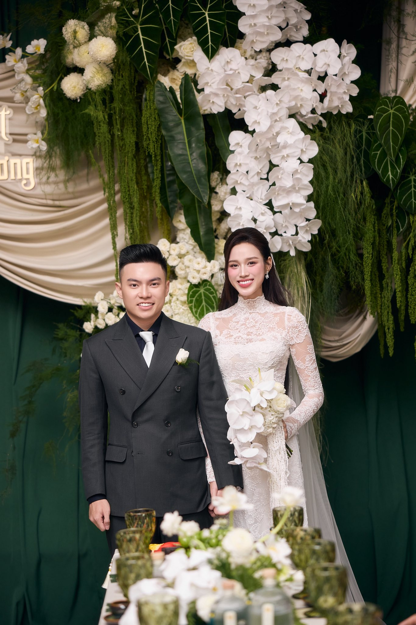 Khoảnh khắc cô dâu – chú rể hào môn xuất hiện lập tức gây sốt. Đỗ Thị Hà diện đầm cưới ren trắng tôn vóc dáng và khoe visual xinh xắn. Trong khi đó, chú rể mặc suit bảnh bao.