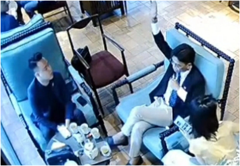 Sau đó, một người hút thuốc mang phong thái, trang phục “tổng tài” (người thành công, đứng đầu công ty, doanh nghiệp) có động tác giơ tay, lập tức người đàn ông ngồi bên cạnh đứng dậy, tiến vào quầy thu ngân, đấm 2 phát vào mặt nhân viên quán, khiến nạn nhân ngã ra sàn. Lúc này, “tổng tài” lại giơ tay ra hiệu rồi hô 3 tiếng “thôi, thôi, thôi”. Người đàn ông lập tức trở về chỗ ngồi.