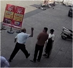 Lúc này nam tài xế lao vào tát nhưng chị H. né được và chạy vào phía trong. Anh L. – chồng chị H., can ngăn, đồng thời dùng điện thoại ghi hình vụ việc. Nam tài xế chạy lại gốc cây gần đó, nhặt hai viên gạch quay lại tấn công anh L. Hai bên tiếp tục có lời nói qua lại, anh L. bị nam tài xế tấn công vào ngực, khuỵu xuống. Sự việc dừng lại khi có người can ngăn.