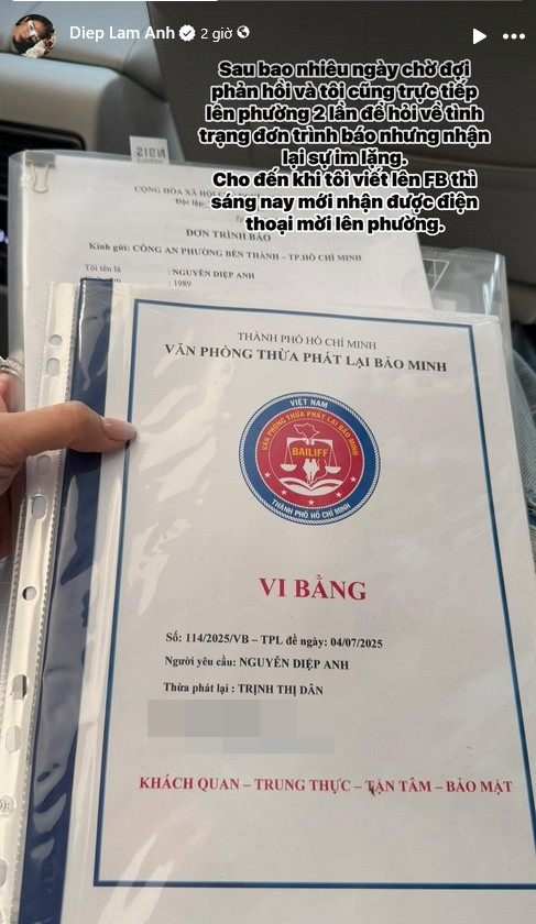 Kèm theo đó, cách đây ít giờ, Diệp Lâm Anh tiếp tục đăng hình ảnh vi bằng kèm dòng trạng thái: “Sau bao nhiêu ngày chờ đợi phản hồi và tôi cũng trực tiếp lên phường 2 lần để hỏi về tình trạng đơn trình báo nhưng nhận lại sự im lặng. Cho đến khi tôi viết lên Facebook thì sáng nay mới nhận được điện thoại mời lên phường”.