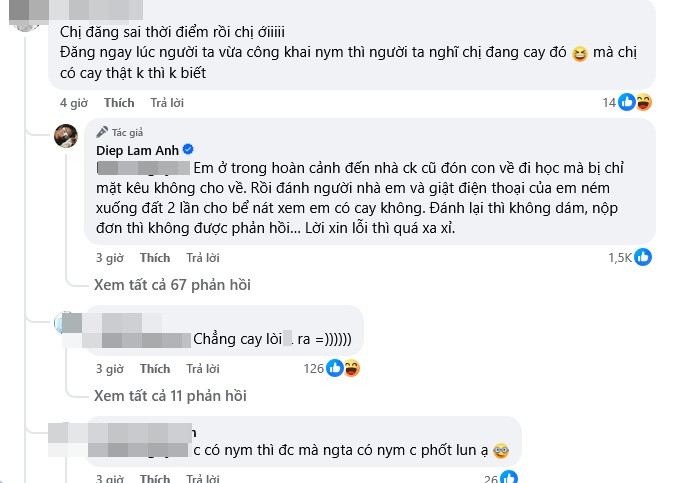 Diệp Lâm Anh lập tức đáp trả: “Em ở trong hoàn cảnh đến nhà chồng cũ đón con về đi học mà bị chỉ mặt kêu không cho về. Rồi đánh người nhà em và giật điện thoại của em ném xuống đất 2 lần cho bể nát xem em có cay không. Đánh lại thì không dám, nộp đơn thì không được phản hồi… Lời xin lỗi thì quá xa xỉ.”