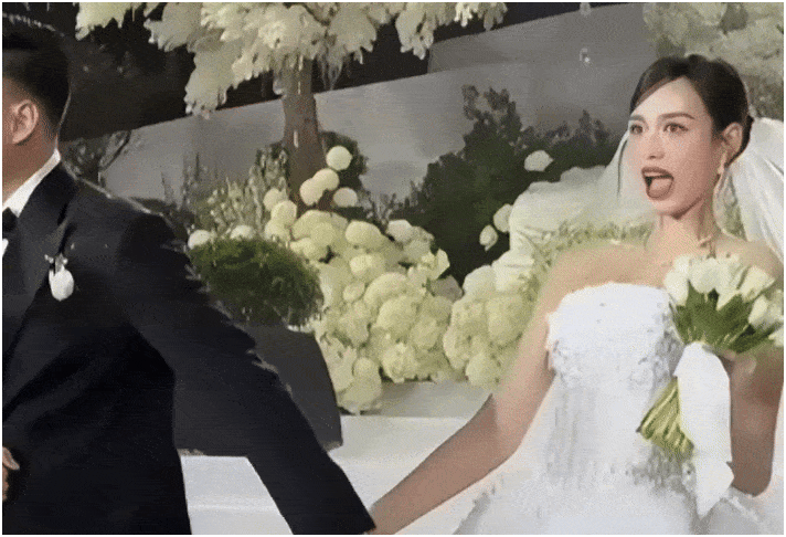 Trong ngày vui, một sự cố nhỏ đã xảy ra. Trên mạng xã hội, dân tình lan truyền đoạn clip ghi lại khoảnh khắc cô dâu Đỗ Thị Hà cùng chú rể nắm chặt tay nhau đi trên lễ đường. Tuy nhiên, phần tà voan dài thượt bất ngờ bị vướng lại phía sau khiến Đỗ Thị Hà hoảng hốt khựng lại.