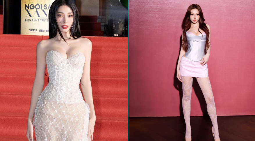 Xuất hiện tại sự kiện, Khổng Tú Quỳnh lựa chọn set đồ mang tông màu pastel nhẹ nhàng nhưng lại có phom cực kỳ tôn vóc dáng. Phần corset ôm sát giúp khoe trọn vòng eo gọn gàng, trong khi thiết kế xẻ sâu khéo léo làm nổi bật vòng một đầy đặn. Kết hợp cùng chân váy ngắn và tất ren mỏng, tổng thể outfit vừa mang hơi hướng tiểu thư hiện đại, lại phảng phất nét quyến rũ rất “đàn bà”.