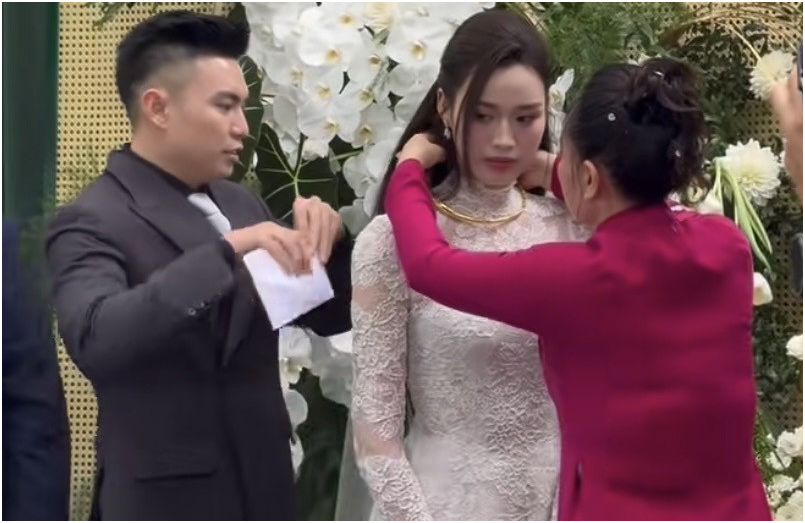 Không chỉ bố chồng, tại buổi lễ mẹ chồng Đỗ Hà cũng trao vàng và của hồi môn cho 2 con. Ngoài ra, cặp đôi cũng nhận được rất nhiều vàng cưới từ họ hàng, bạn bè,…
