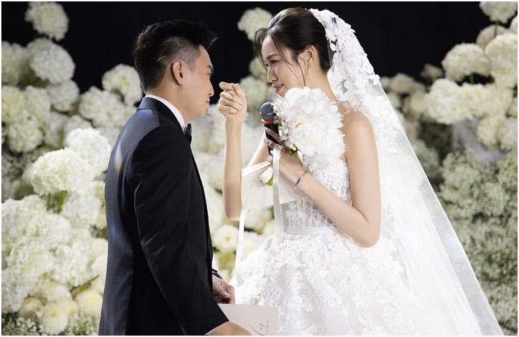 Sau lời phát biểu, không ít khách mời không kìm được nước mắt, trong đó có hoa hậu Đỗ Mỹ Linh, á hậu Hoàng Thùy, hoa hậu Lương Thùy Linh và dàn người đẹp thân thiết. Chú rể Nguyễn Viết Vương cũng rưng rưng, không ngớt trao những cái ôm và nụ hôn dịu dàng cho cô dâu.