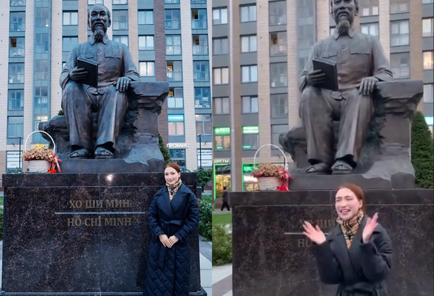 Theo đó, Hòa Minzy cho biết: “Con tới Nga và không thể nào không ghé thăm tượng đài Chủ Tịch Hồ Chí Minh kính yêu của chúng con. Ngày hôm nay còn vui hơn khi tới cùng con là rất nhiều các thanh niên, sinh viên của Việt Nam, chúng con đã hát vang lời ca ‘Như có Bác Hồ trong ngày vui đại thắng’.