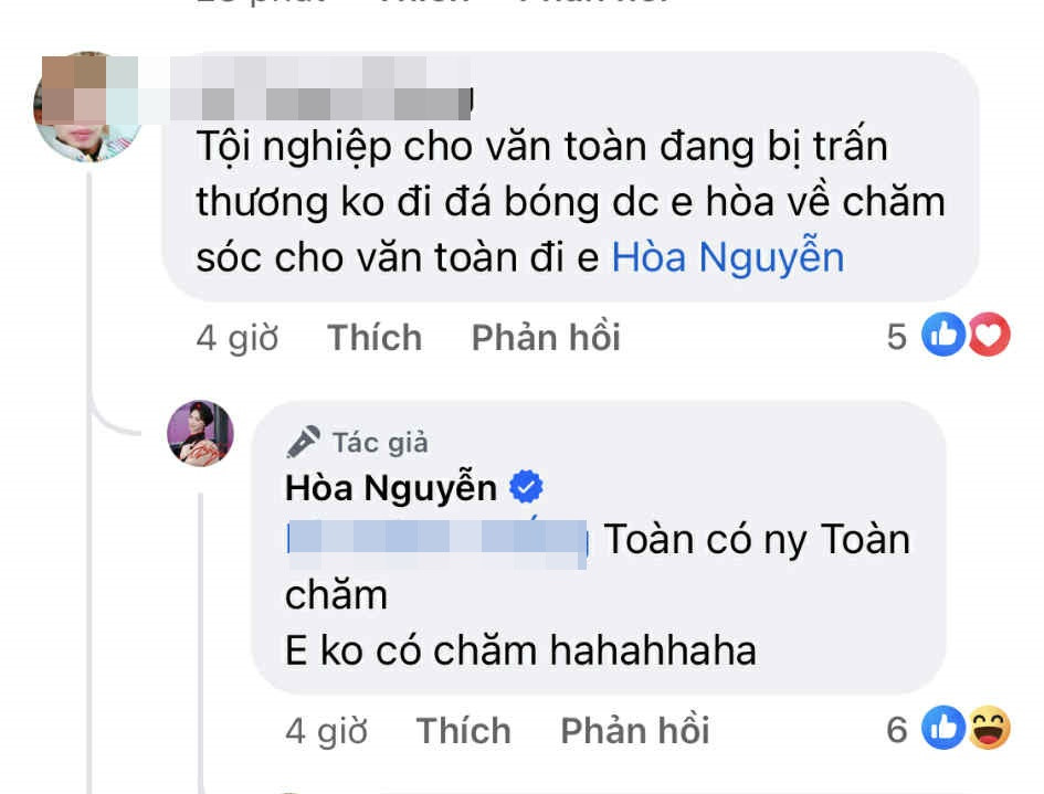 Ngoài ra, khi được fan nhắc khéo: “Tội nghiệp cho Văn Toàn đang bị chấn thương không đi đá bóng được. Em Hoà về chăm sóc cho Văn Toàn đi em!”. Giọng ca Bắc Bling tiết lộ chấn động: “Toàn có người yêu Toàn chăm. Em không có chăm nha”.