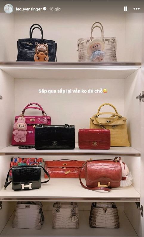Cách đây ít giờ, “nữ hoàng phòng trà” cũng khoe bộ sưu tập túi hiệu có giá hàng chục tỷ đồng khiến dân tình choáng váng. Góc tủ của Lệ Quyên không quá đồ sộ như nhiều mỹ nhân Việt khác nhưng lại là những món đồ đắt đỏ bậc nhất thế giới gói gọn trong một tấm hình.
