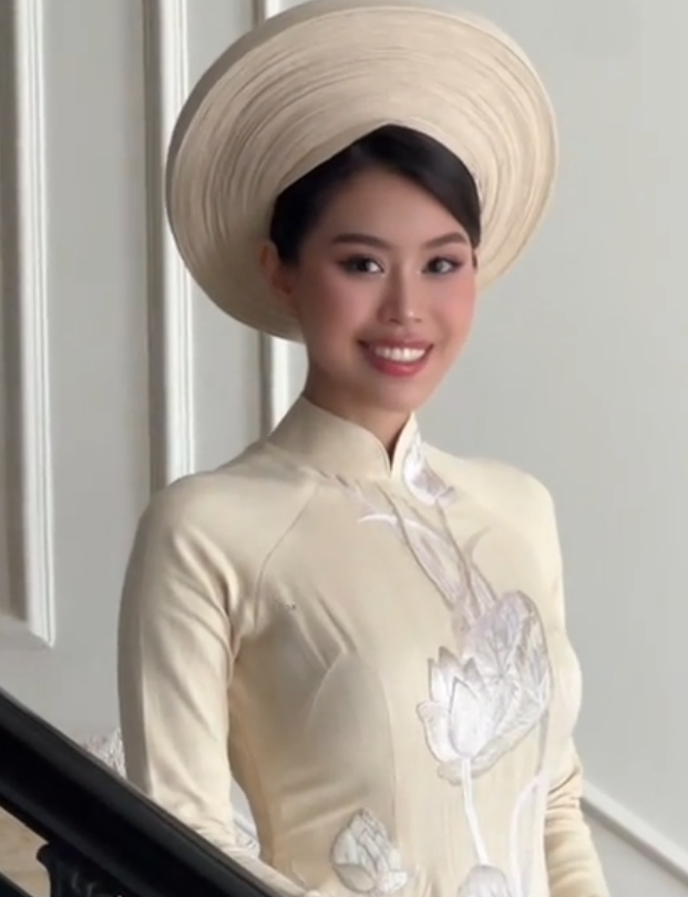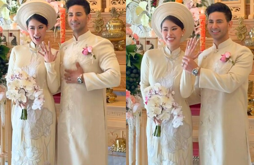 Từ hình ảnh lan truyền trên mạng xã hội cho thấy, con gái tỷ phú Johnathan Hạnh Nguyễn diện áo dài trắng, trang điểm nhẹ nhàng nhưng vẫn khoe trọn được vóc dáng quyến rũ cùng thần thái sang chảnh. Bộ trang phục cô chọn được nhận xét đồng điều với chú rể Justin Cohen.