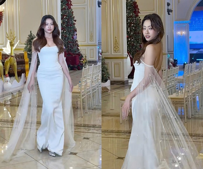 Miss World Vietnam 2019 diện chiếc trắng ôm dáng tinh tế, với điểm nhấn là tà bay tạo cảm giác mềm mại, thướt tha khi di chuyển.