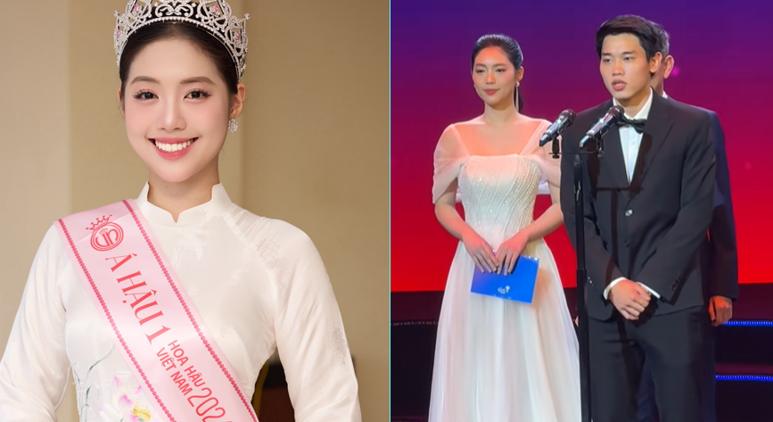 Và khoảnh khắc Đình Bắc lên nhận giải VĐV trẻ của năm, Đội tuyển của năm (đội tuyển U22 Việt Nam giành HCV tại SEA Games 33) thì Á hậu Châu Anh chính là người được giao nhiệm vụ công bố. Tạo nên khoảnh khắc cả hai đứng chung một khung hình ngay cả trên sân khấu.