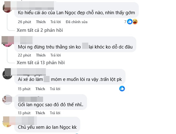 Phía dưới loạt clip, netizen để lại bình luận: “Không hiểu áo Lan Ngọc đẹp chỗ nào, nhìn thấy gớm”, “Đẹp mà cái áo dị ứng quá”, “Ai xé áo Lan Ngọc vậy”…