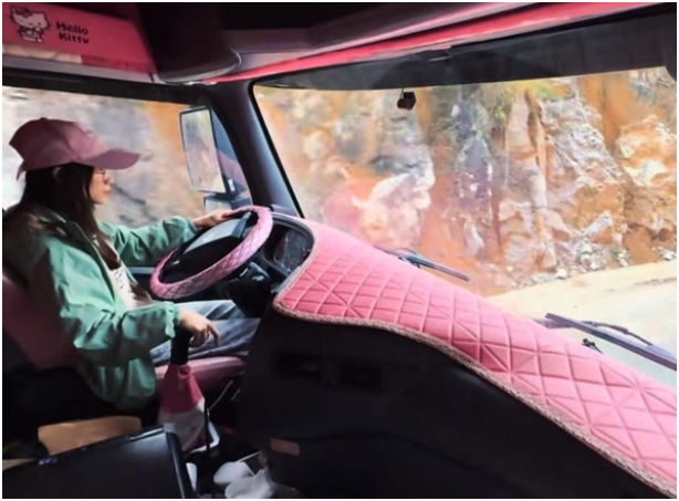 Dù thân hình nhỏ nhắn, nặng khoảng 40kg, N.H. vẫn khiến nhiều người ngạc nhiên khi có thể điều khiển chiếc xe tải trọng lớn, nặng tới 30 tấn, di chuyển trên nhiều cung đường dài. Để tạo dấu ấn cá nhân, cô còn trang trí cabin xe bằng những gam màu tươi sáng, dán hình Doraemon, Hello Kitty dễ thương.