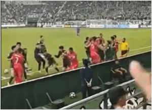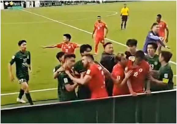 Đáng chú ý khi tình huống này xảy ra, rất nhiều cổ động viên Trung Quốc trên khán đài đã ném nhiều chai, lọ xuống người của các cầu thủ Công an Hà Nội. Cuộc hỗn loạn xảy ra trong vòng hơn 6 phút khiến trọng tài chính phải rút tới 4 tấm thẻ vàng cho cả hai đội.
