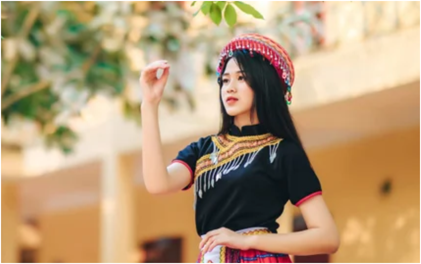 Trong những shoot hình, nàng hậu diện váy xòe họa tiết thổ cẩm. Gương mặt bầu bĩnh, đôi mắt to tròn long lanh, nụ cười ngại ngùng cùng mái tóc dài đen nhánh khiến ai cũng phải “thương nhớ”.