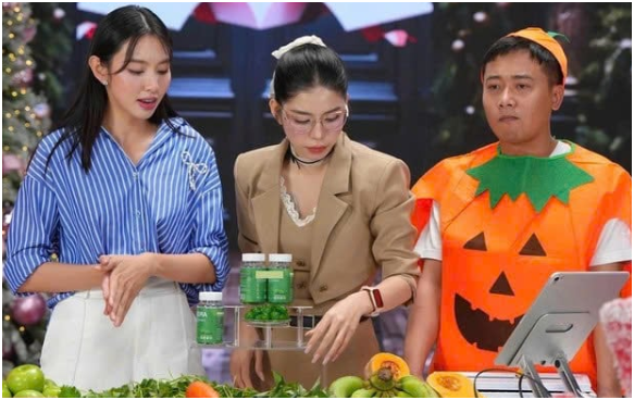 Hoa hậu Thùy Tiên, Quang Linh Vlogs và Hằng Du Mục tại phiên livestream quảng cáo kẹo Kera. Ảnh: Chụp màn hình.