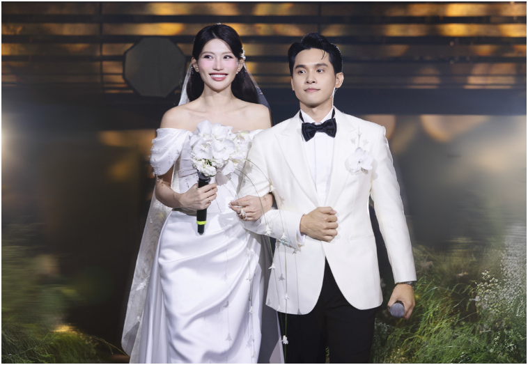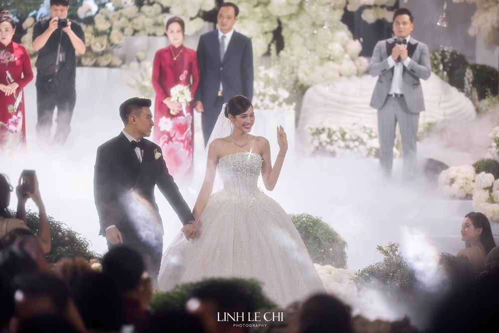 Xuất hiện trong ngày trọng đại, cô dâu diện váy cưới màu trắng chất liệu vải cao cấp, khoe trọn visual điểm 10. Trong khi đó, chú rể bảnh bao với suit trắng và quần âu.