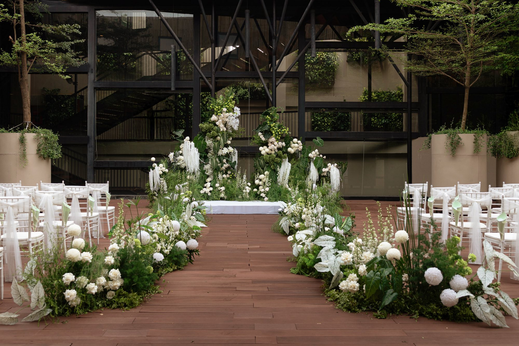 Không gian tiệc cưới được trang trí với tông màu xanh trắng chủ đạo với nhiều hoa tươi lấy cảm hứng từ những cánh rừng Đà Lạt – quê hương của cô dâu. Concept trang trí mang ý nghĩa về sự phát triển hài hòa, tươi mới, bình yên và hy vọng cho cuộc sống hôn nhân. Màu xanh lá đại diện cho thiên nhiên, sự sinh sôi, còn màu trắng tượng trưng cho sự tinh khôi và thuần khiết, tạo nên một không gian vừa hiện đại, sang trọng, vừa gần gũi và lãng mạn.