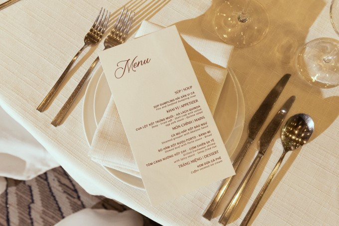Bên cạnh visual dâu – rể đẹp tuyệt đối diện ảnh, một trong những điều được hội “ăn cưới online” quan tâm chính là menu tiệc cưới. Thực đơn đám cưới được hé lộ với 6 món sang xịn mịn bao gồm: súp dumpling hải sản vi cá, cua lột xốt trứng muối – xà lách quinoa, cá mú hấp xốt bào ngư, bò hầm xốt rượu Porto, tôm càng nướng xốt cay ăn cùng cơm chiên sa tế, khép lại là món tráng miệng kem dừa cà phê.