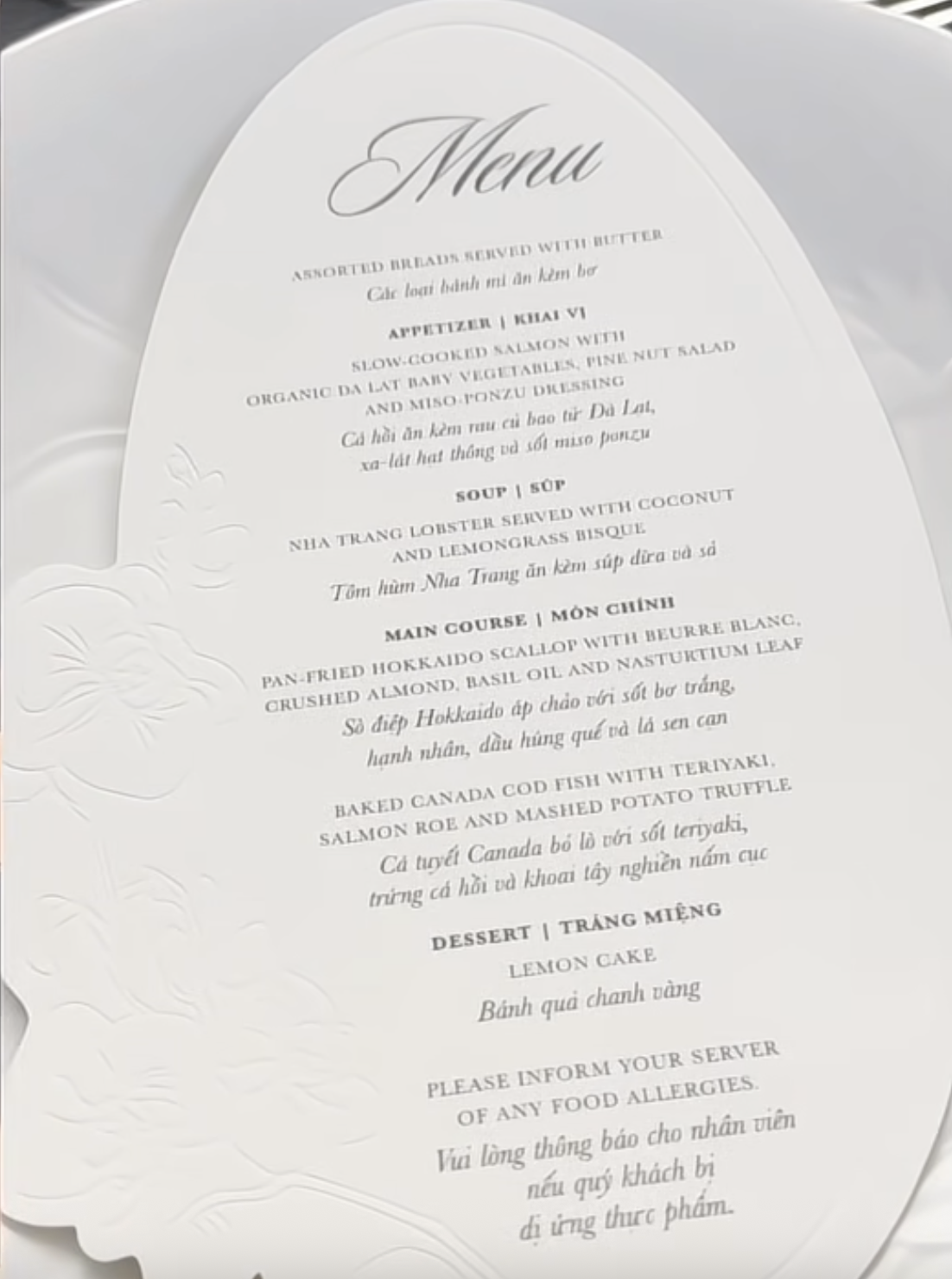 Menu tiệc cưới hoa hậu Đỗ Thị Hà và chú rể Viết Vương ở Hà Nội