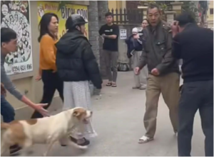 Khi hai bên đang ẩu đả, một nam thanh niên dắt theo con chó lớn bất ngờ xuất hiện tại hiện trường. Người này sau đó đẩy con chó về phía hai người đang đánh nhau.