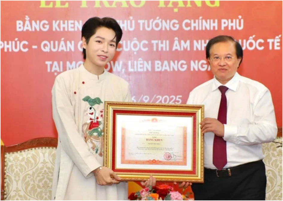 Nhờ góp công lớn trong việc lan tỏa giá trị lịch sử – văn hóa – nghệ thuật dân tộc tới bạn bè quốc tế, theo thông tin từ Bộ VHTTDL hôm nay (ngày 26/9), Phó Thủ tướng Thường trực Chính phủ Nguyễn Hòa Bình đã thay mặt Thủ tướng ký Quyết định số 2135/QĐ-TTg về việc trao tặng Bằng khen của Thủ tướng Chính phủ cho Đức Phúc vì đã đạt thành tích xuất sắc khi giành giải Quán quân tại Cuộc thi Âm nhạc quốc tế Intervision 2025, tổ chức tại thủ đô Moscow, Liên bang Nga.