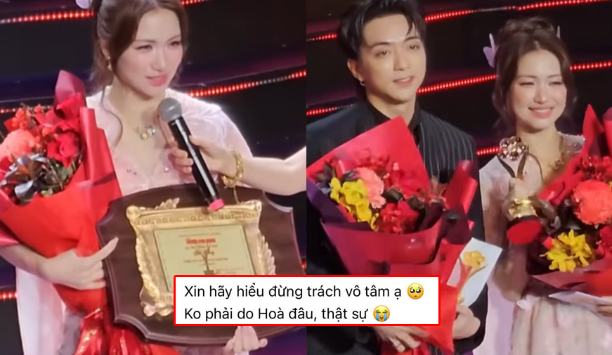 “Biết là sóng trực tiếp nên khi nhận giải con không có nói cảm ơn như mọi khi, con muốn cảm ơn sau để dành khoảnh khắc tuyệt vời này mời bố mẹ lên sân khấu. Sau khi bố mẹ lên, Hòa và bố mẹ cũng không nói một lời nào cướp sóng gì hết, 3 người chỉ đứng đó rồi đi xuống. Suốt 12 năm, đây là lần đầu tiên bố mẹ được cùng Hòa nhận giải thưởng. Hôm nay Hòa được 3 giải thưởng, 1 lần không nói, 1 lần nói rất ngắn và 1 lần bố mẹ lên cùng rồi không nói gì thêm. Xin hãy hiểu đừng trách vô tâm ạ. Không phải do Hòa đâu, thật sự”, nữ ca sĩ giải thích.